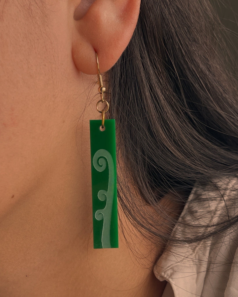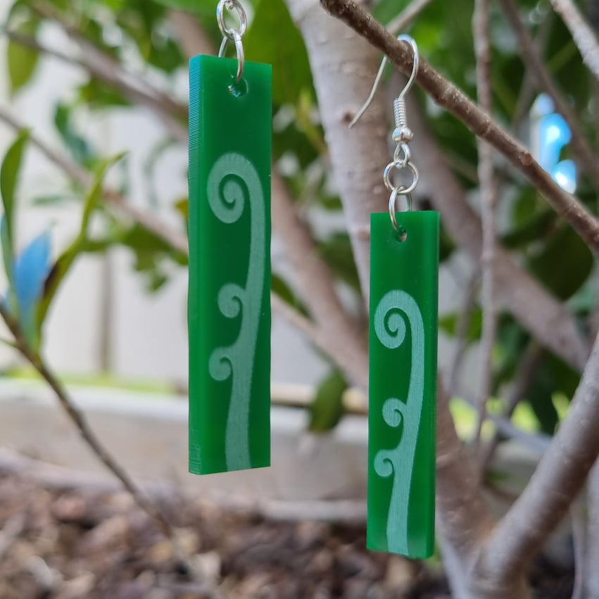 Growing fern frond engraved on lightweight green acrylic. Each piece is approximately 4cm long.